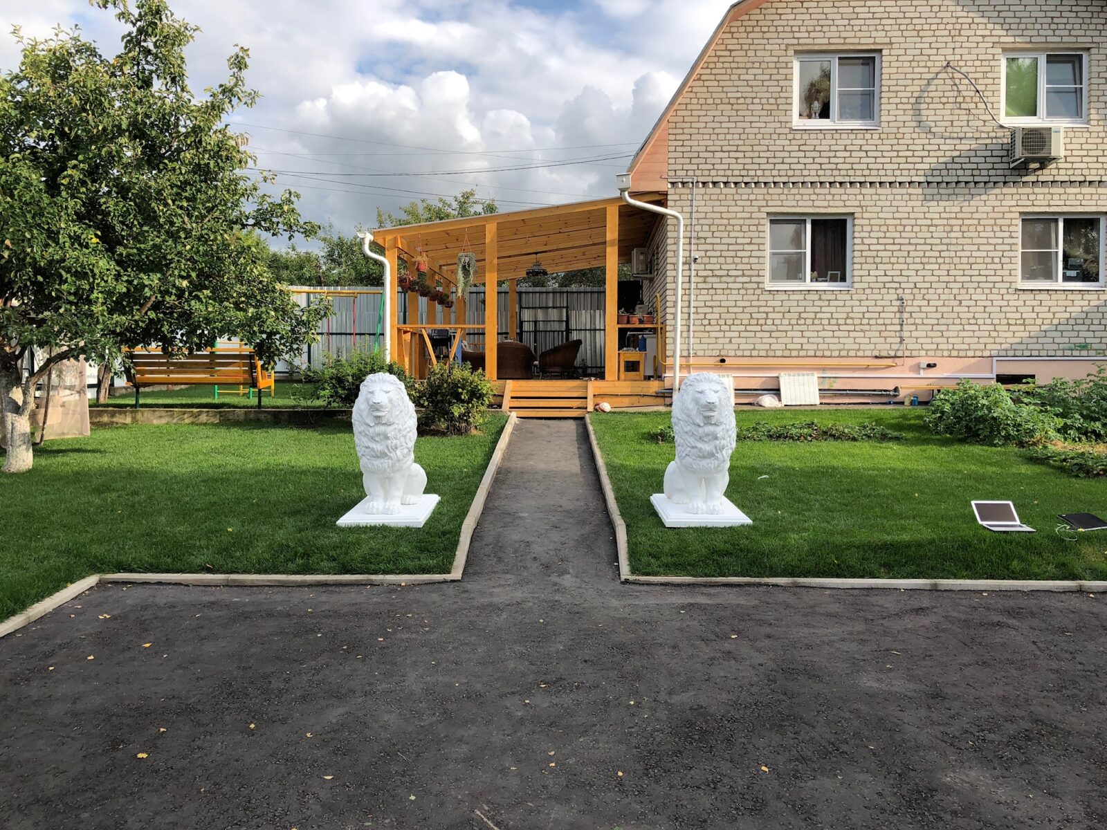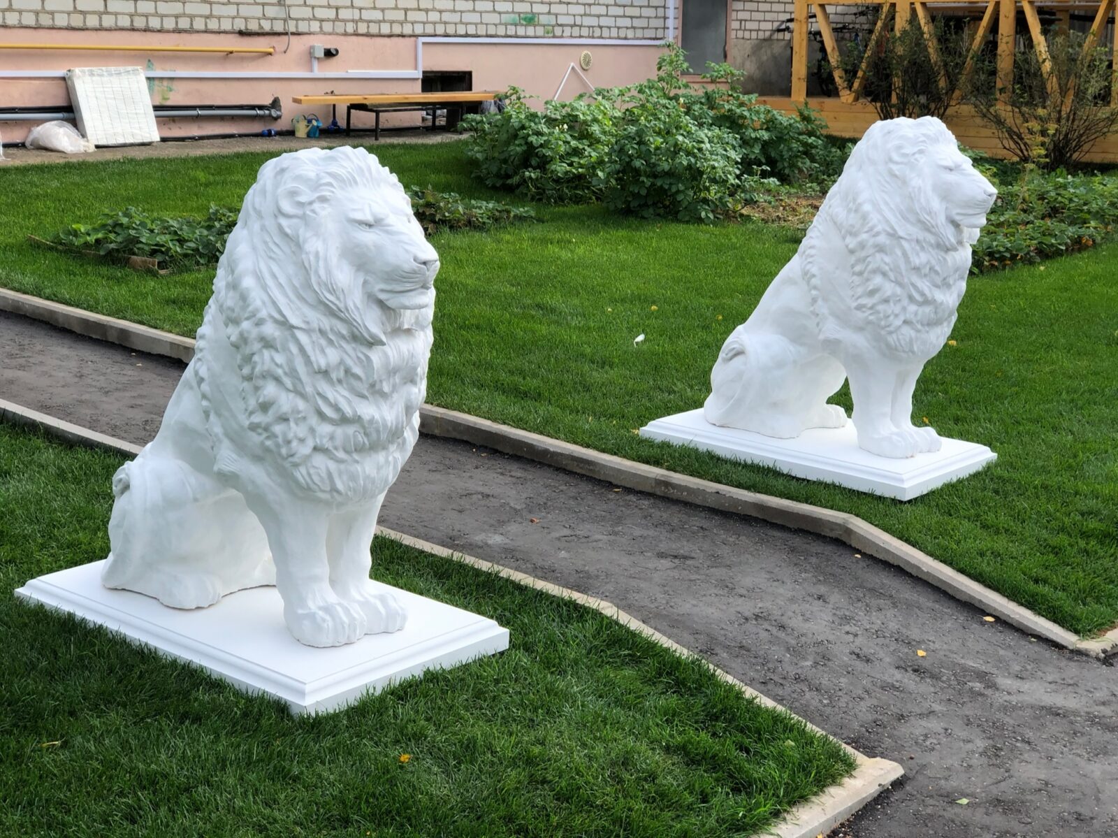 Львы стали частью уютного семейного пространства: аккуратный газон, деревья, деревянная беседка — всё это создаёт атмосферу загородного комфорта. Скульптуры подчёркивают статус дома, но при этом не «давят» — белый цвет делает их лёгкими и дружелюбными.