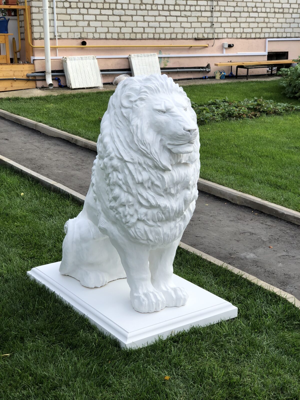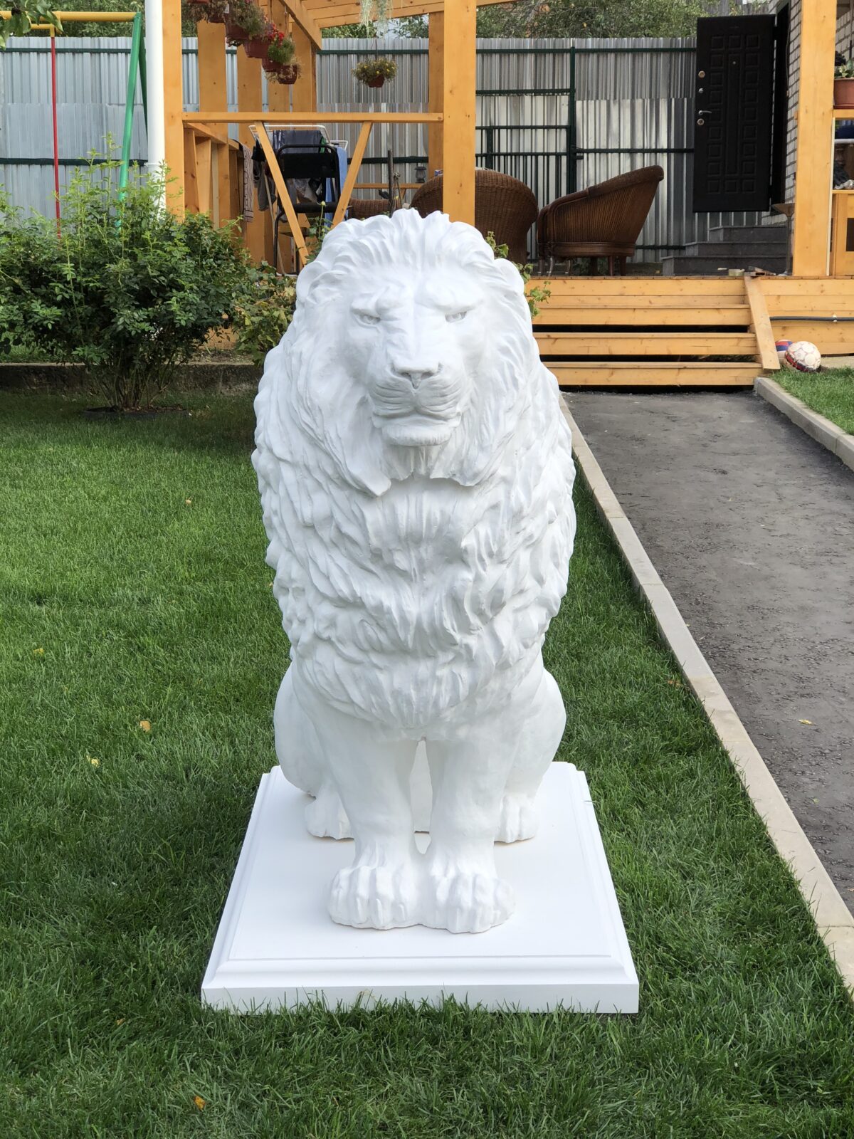 Белый цвет — универсальный и одновременно редкий выбор для подобной скульптуры. Он создаёт ощущение свежести, визуально расширяет пространство и прекрасно сочетается с любой зеленью сада. У этого заказчика видно, как белые львы буквально «сияют» на фоне газона и деревьев, придавая участку аккуратный и дорогой вид.