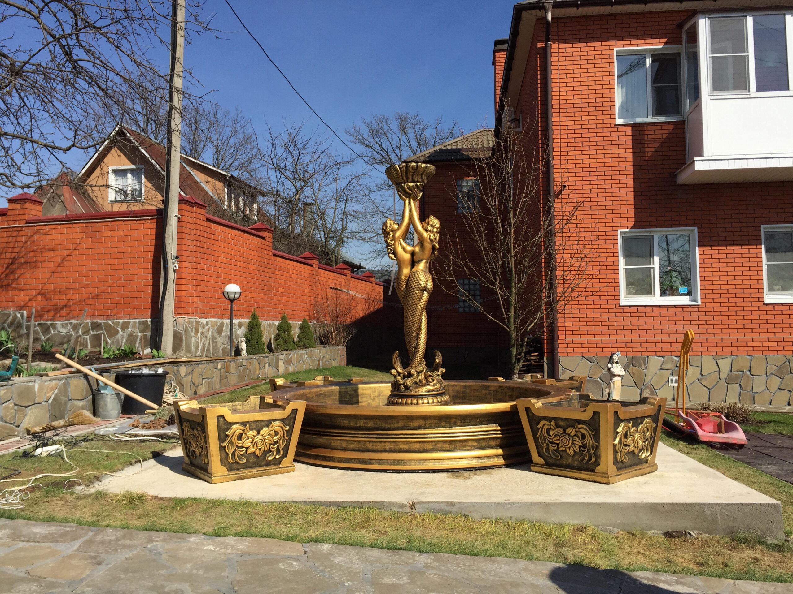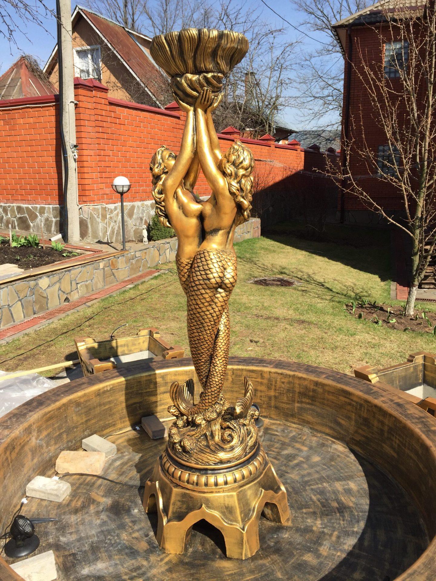 В центре площадки разместился королевский фонтан с русалками — узнаваемая модель, выполненная из бетона и вручную окрашенная в глубокий золотой оттенок с лёгкой патиной.
