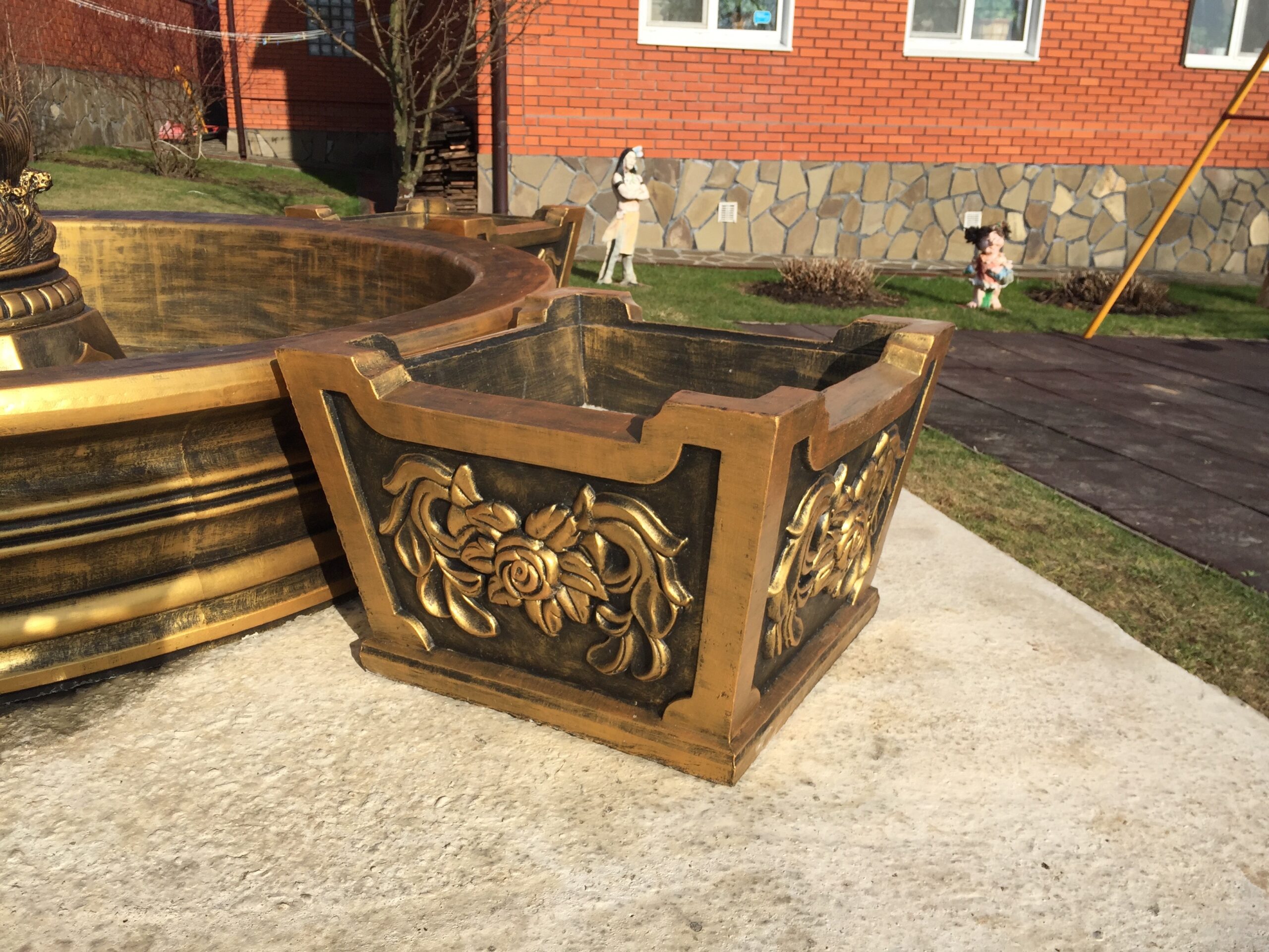 Вместе с фонтаном мы изготовили и установили комплект золотых декоративных вазонов.